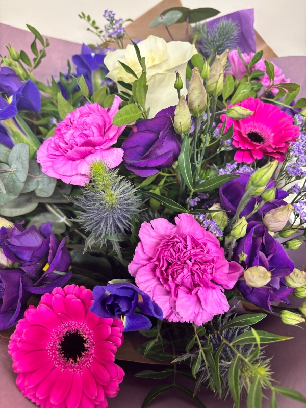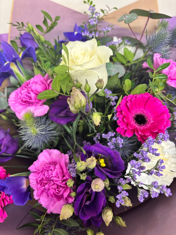 A breathtaking blend of purples, mauves, hot pinks, whites and elegant foliage. Featuring lizianthus, roses, germini and iris. This stunning bouquet is perfect for any occasion.